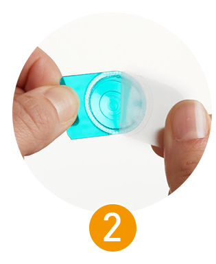 Pak de patches vast bij het platte gedeelte en scheur één patch af langs de scheurrand. Druk daarbij niet op het groenblauwe cupje.