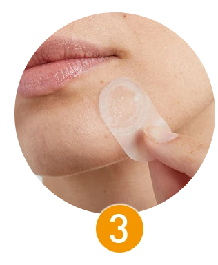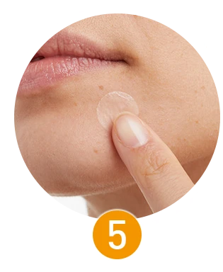 Breng dit deel van het doorzichtige applicatorfolie aan op het puistje, eventueel met behulp van een spiegel, en druk de patch voorzichtig en goed stevig vast over het puistje.